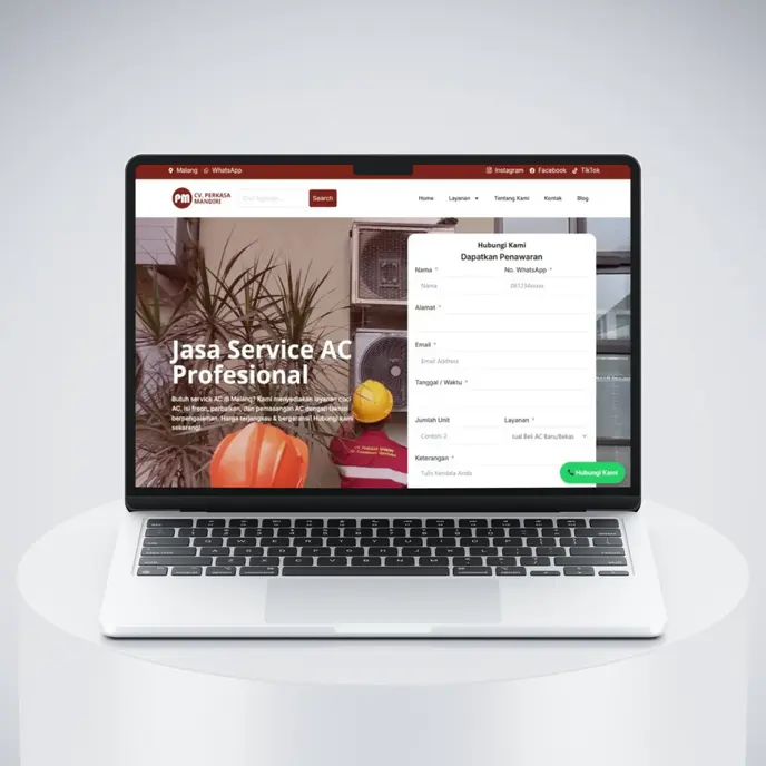 Website jasa service AC di wilayah Malang Raya yang menyediakan layanan perbaikan, perawatan, dan pemasangan AC untuk rumah, kantor, dan bisnis dengan teknisi profesional.